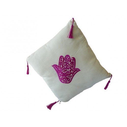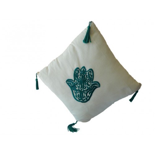 Handmade silk embroideredbeige cushion with SABRA (silk vegetal) as FATIMA moroccan design