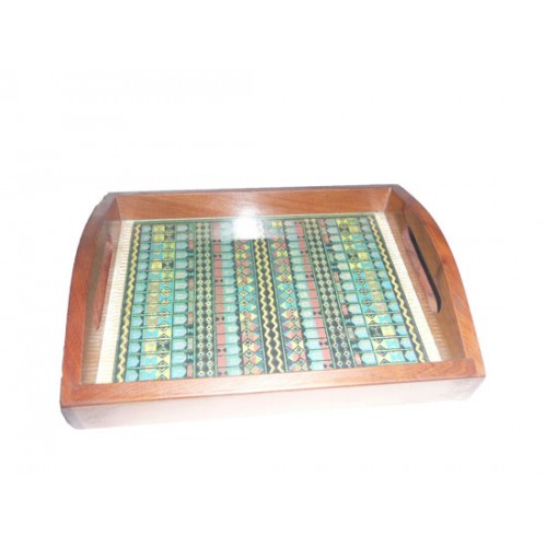 A Handmade Moroccan tray made in burl wood with the interior base in a special graphic design. Beautiful as a decoration as well.