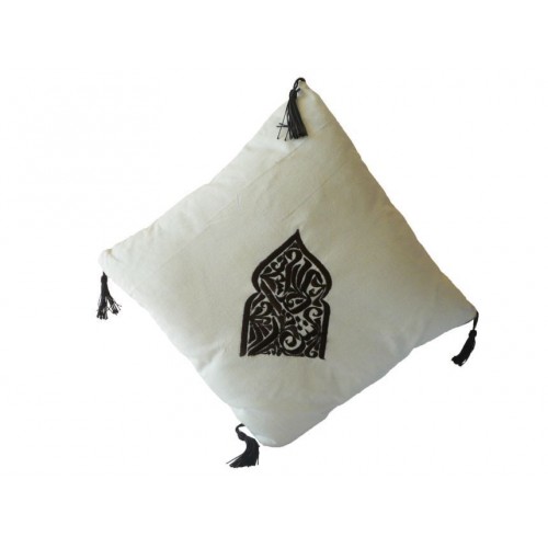 Handmade silk embroidered beige cushion with SABRA(silk vegetal) and DAR moroccan design.