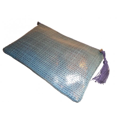 Handmade leather blue evening handbag accessorised with beautiful handmade "pompons".